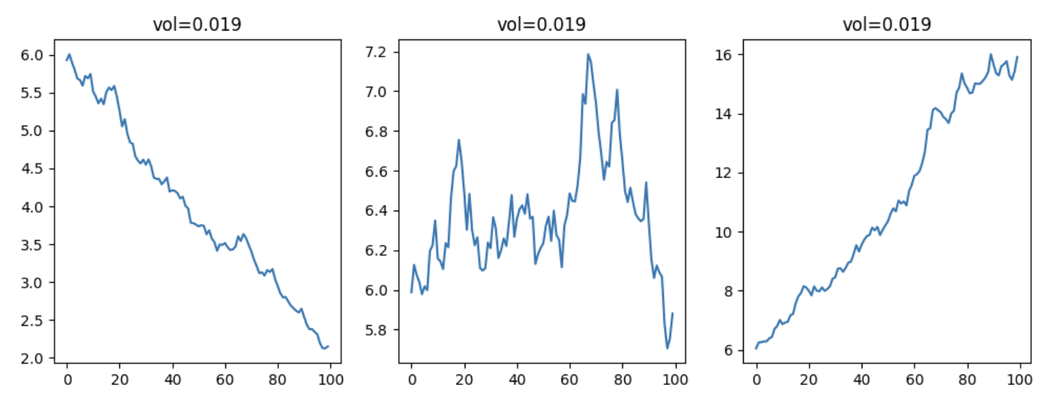 比如,如果我们想研究上升趋势和下降趋势下的某些指标,就需要有能力先构建出符合趋势的价格序列出来。下面的例子就演示了如何生成这样的序列,并且绘制成图形: