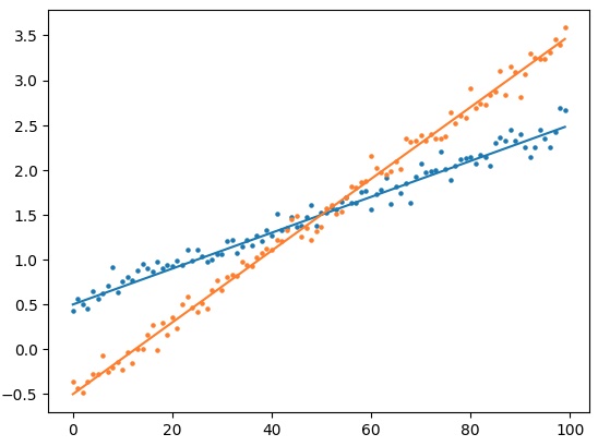 人类的视觉有着强大的模式发现能力。我们很容易看出橙色点的上升趋势更强。但是,如果要让计算机也知道哪一组数据更好,则需要通过直线拟合,找出趋势线,再比较趋势线的斜率才能确定。直线拟合,或者曲线拟合(cureve fit),或者多项式拟合,都是线性回归问题。