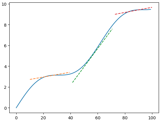 这段代码计算了从第10个周期起,过去10个点的拟合直线的斜率,并且在曲线的转折点上,我们绘制了它的切线。这些切线,正是通过拟合直线的参数来生成的。