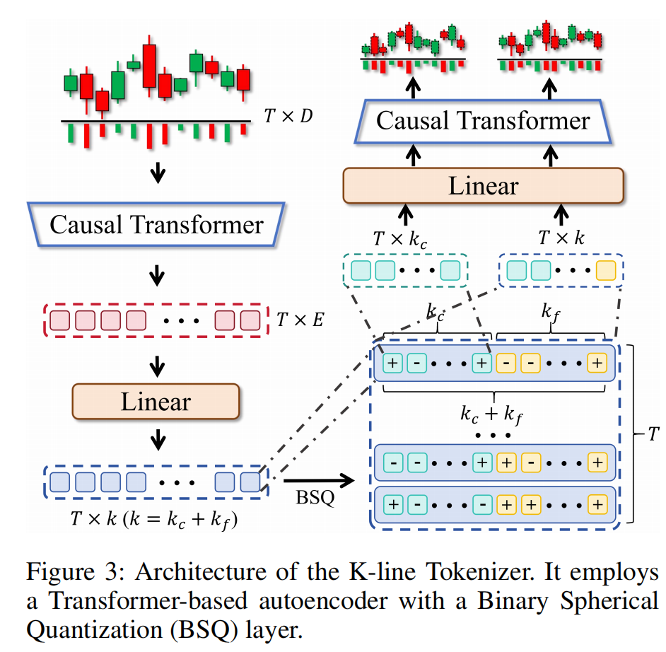 在 NLP 领域,token 是语言的最小单元,而在 Kronos 的体系中,金融市场语言的最小单位是 “语义单元”,这个单元由单根或多根 K 线共同构成。但原始 K 线包含开盘价、最高价等六维连续数据,没法直接成为承载语义的 “市场语言单元”,所以研究团队专门设计了针对 K 线的分词器(Tokenizer)。