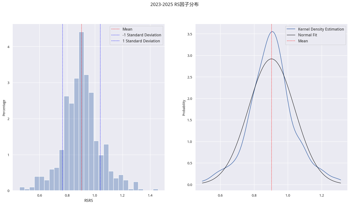 如果我们以此确定阈值,就会犯了前视偏差的错误:我们把 2023 到 2025 的全部数据纳入了统计,但如果交易发生在 2023 年底呢?除非这些年来,RSRS 的分布一直保持不变,否则,我们就一定是参考了错误的阈值。