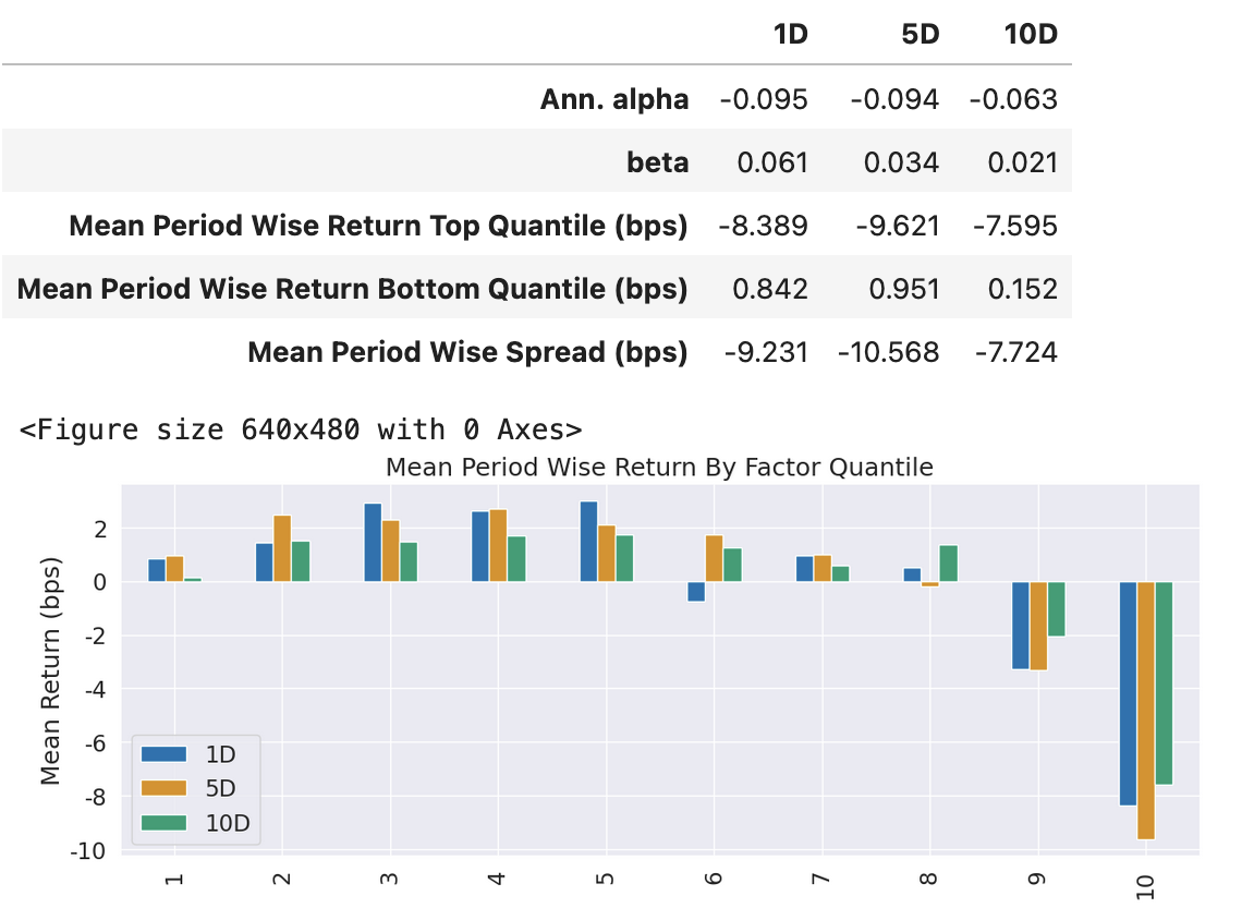 输出结果有点小意外,没有出现你期待的高收益,基至年化 Alpha 还是负的。不过,对 Alphalens 的输出我们需要辩证来看,这个简单的测试,已经说明了这个因子很可能是有 Alpha 存在的(它的 beta 接近于零),只是年化为负,这种情况下,我们只要修改因子的方向,即可得到正的年化收益。