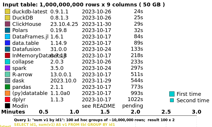 sqlite非常轻量,基于内存或者文件作为存储,无须像其它数据库一样进行复杂的服务器安装和设置。它是市占率最高的数据库 -- 但未来可能会有所不同:仅就功能而言,duckdb不仅仅完全实现了sqlite的所有功能,它甚至可能比postgres的语法还要丰富。而在性能上,sqlite就更是难以望其项背 -- 实际上,在大数据集的join和group by操作上,H2O.ai的测试表明,在与clickhouse, porlars一众明星选手打排位赛,duckdb都能排在第一位!