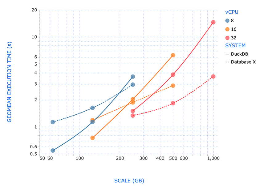 不过,数据库性能测试的基准是TPC-DS测试。根据Fivetran CEO的测试,duckdb在存储文件大小小于250GB时,性能优于最好的商业数据库,但在1TB数据集时(此时使用32核心CPU和128GB内存),它的性能会落后不少。