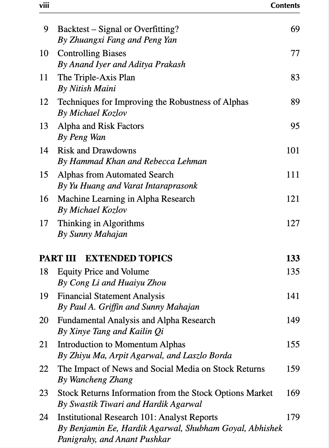 第二部分从第4章开始,到第17章结束,讨论了寻找Alpha过程中的方方面面,比如如何处理数据、评估Alpha因子,控制偏差等等。第15章和第16章介绍了如何使用机器学习,自动搜索因子。