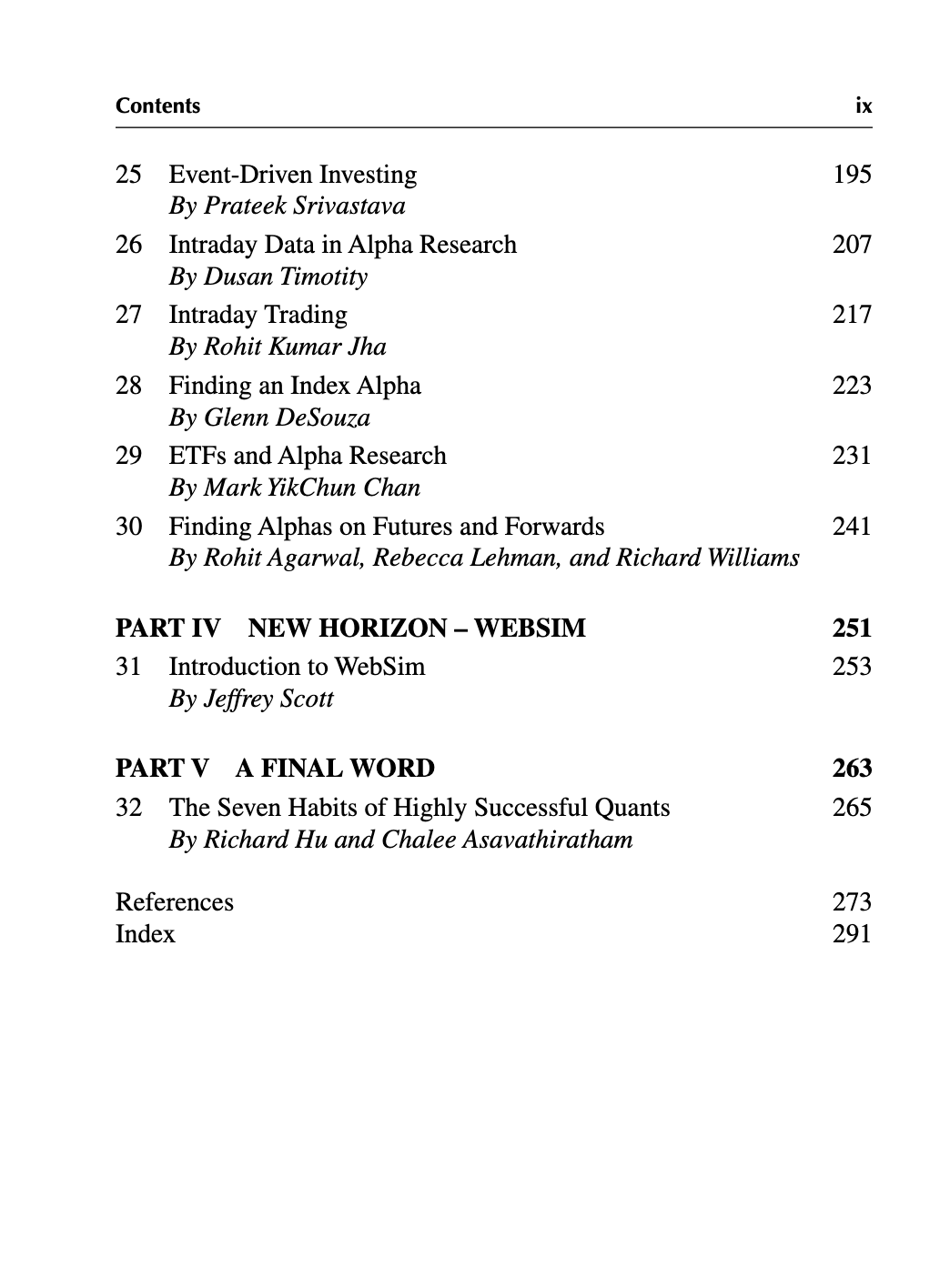 这本书不到300页,比较适合入门。在前两章中介绍了Alpha和量化投资的简短历史。考虑到关于量化投资有很多以讹传讹的信息在广泛流传(正如我们已经看到的,什么是Alpha,就有好几种说法 -- 这还不包括所谓的Alpha策略),由Igor Tulchinshky作的序,无疑可以起到正本清源的作用。