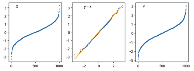 在50%分位处,X的采样点\(x_1\)应该与50%分位处的\(y_1\)非常接近(由于是随机变量,所以也很难完全相等);在25%分位处,75%分位处,或者进一步推广,在任意分位数处,两者的采样都非常接近。