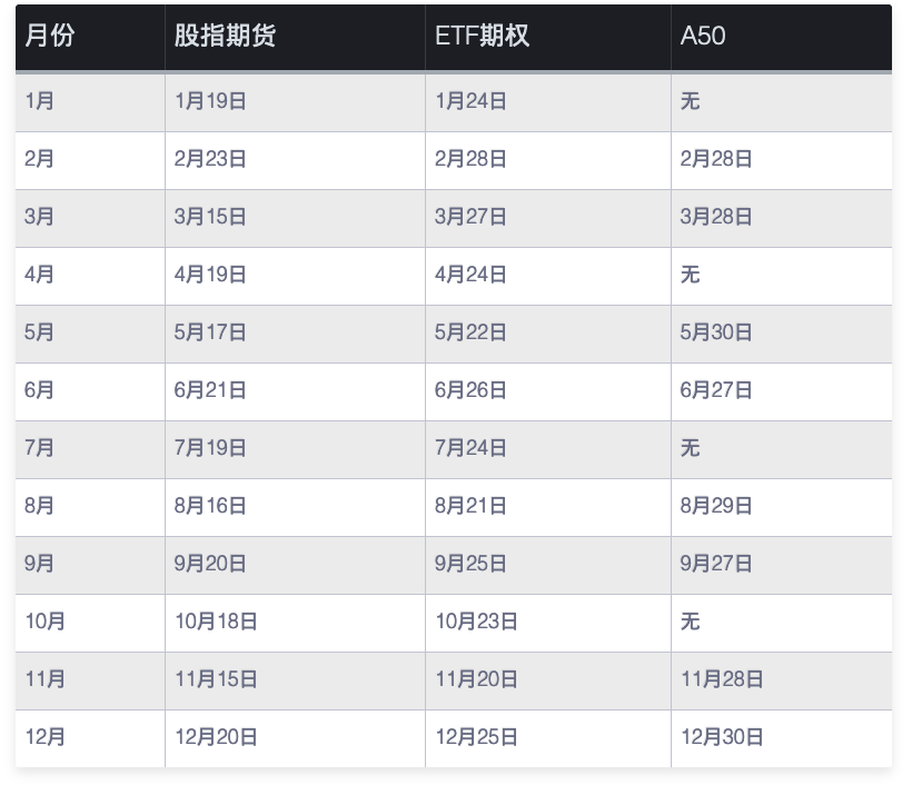 股指期货的交割日为每月的第三周周五;ETF期权交割日为每月第四周的周三;A50交割日为相关月的倒数第二个交易日。