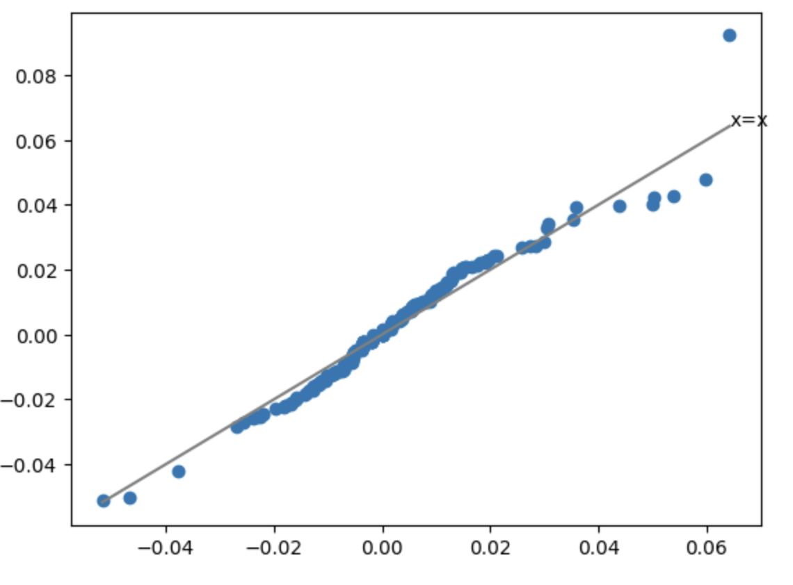 如果上述概念还不好理解,我们可以再举一个更直观的例子。通过QQ图来判断两个证券标的是否存在强相关性。比如,我们以两支同行业个股为例,取它们最近250期日线,计算每日回报率,对其进行排序后绘图: