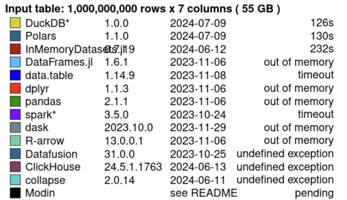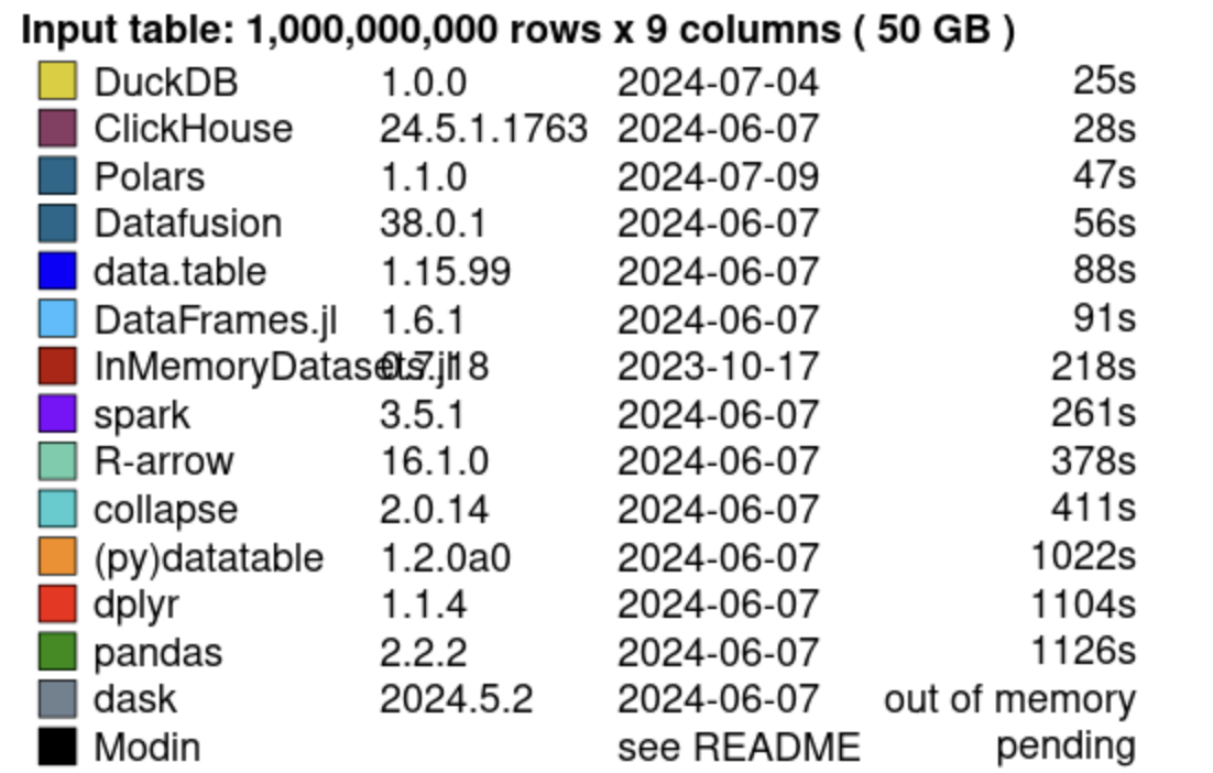 Duckdb,Clickhouse 和 Polars 位居前三。Dask 会出 out-of-memory 错误,也是出人意料。这还做什么大数据、分布式啊。Pandas 虽然用了接近 20 分钟,但最终还是给出了结果,而 Modin 还不知道在几条街之后,你这要如何无缝替换 pandas?