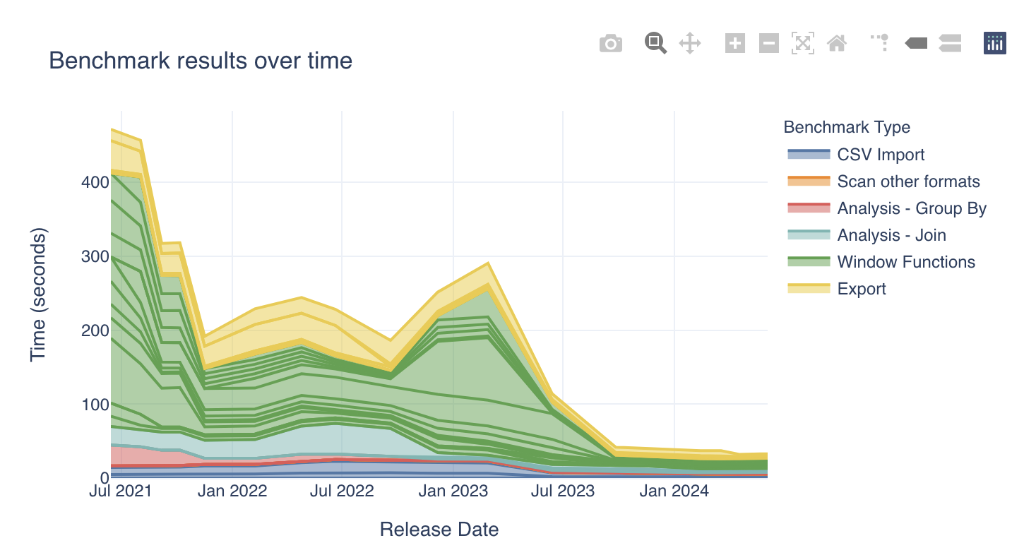 在这次发布之后, duckdb 还发布了历年来 duckdb 性能上的提升: