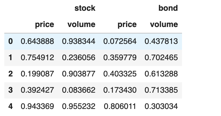 左上角一片空白,因此,这个DataFrame的行索引和列索引都还没有命名(乍一看挺反直觉的,难道列索引不是stock, bond吗)!