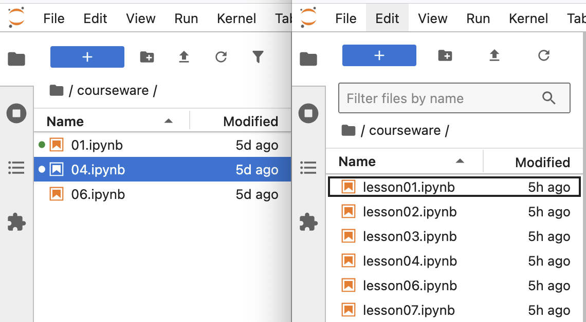 我们提供给用户的链接是 /courseware/01.ipynb,但 01.ipynb 在 24 课中并不存在;在 24 课中,存在的是 lesson01.ipynb。这是一个典型的部署问题。在因子课中,所有的文件名都只有序号,但在 24 课中,源文件画蛇添足地带上了 lesson 的前缀。