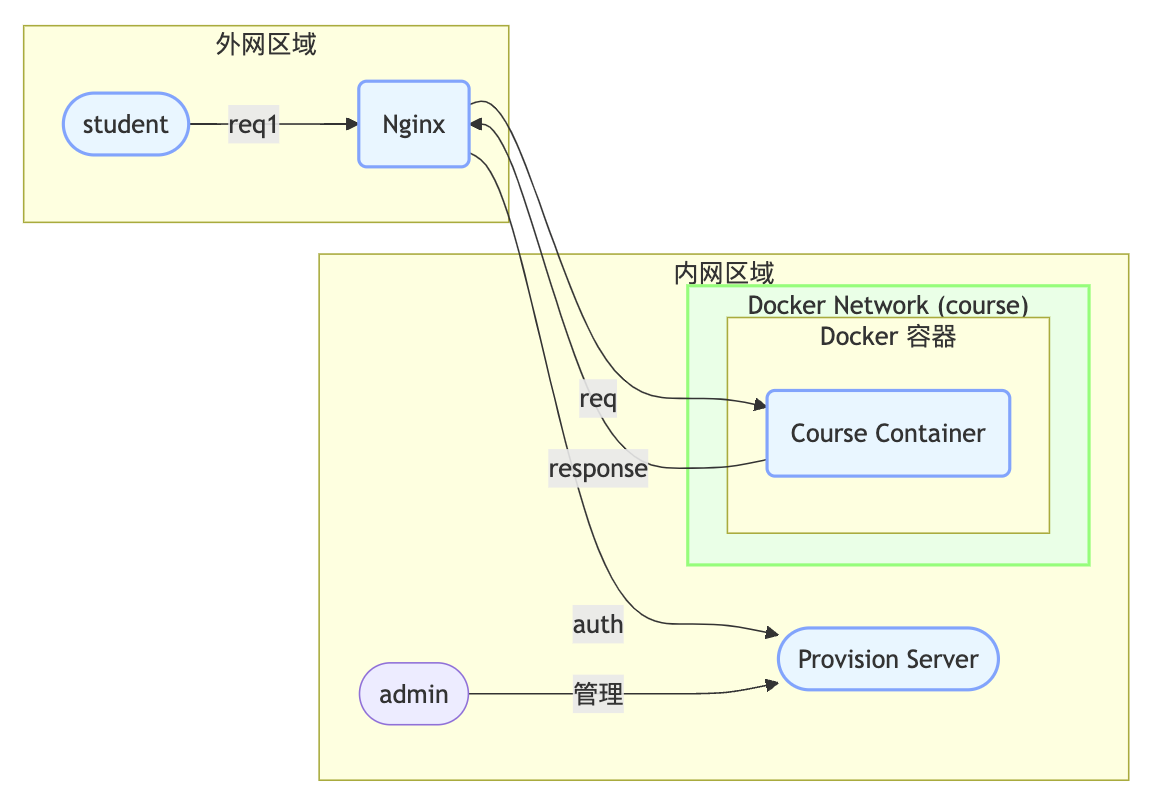 - nginx 要能访问主机上的 provision server. Provisioin server 只部署在主机中,因为它需要为新学员创建容器。