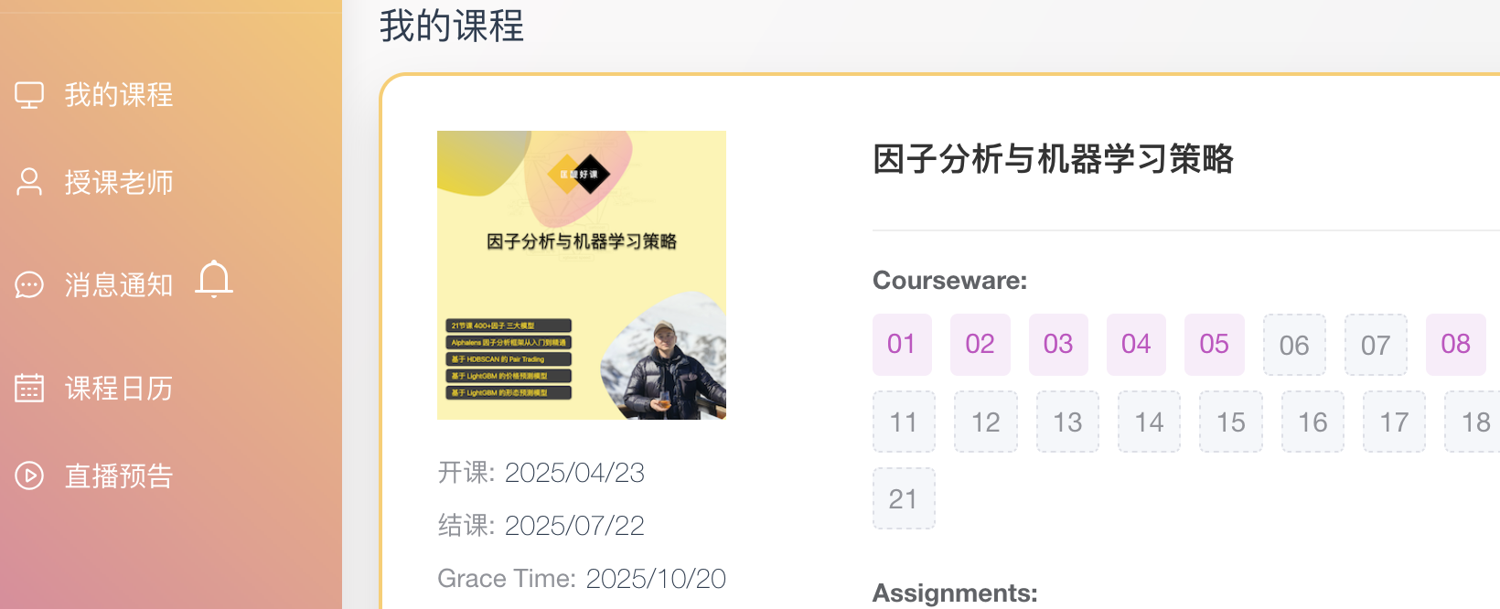 登录之后,就可以看到他所报名的课程:
