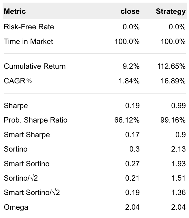 ms . report ( "metrics" , benchmark = benchmark , periods_per_year = 12 )