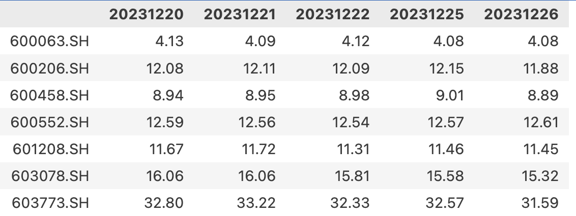 barss = xtdata . get_market_data ( stock_list = secs , count = 10 )