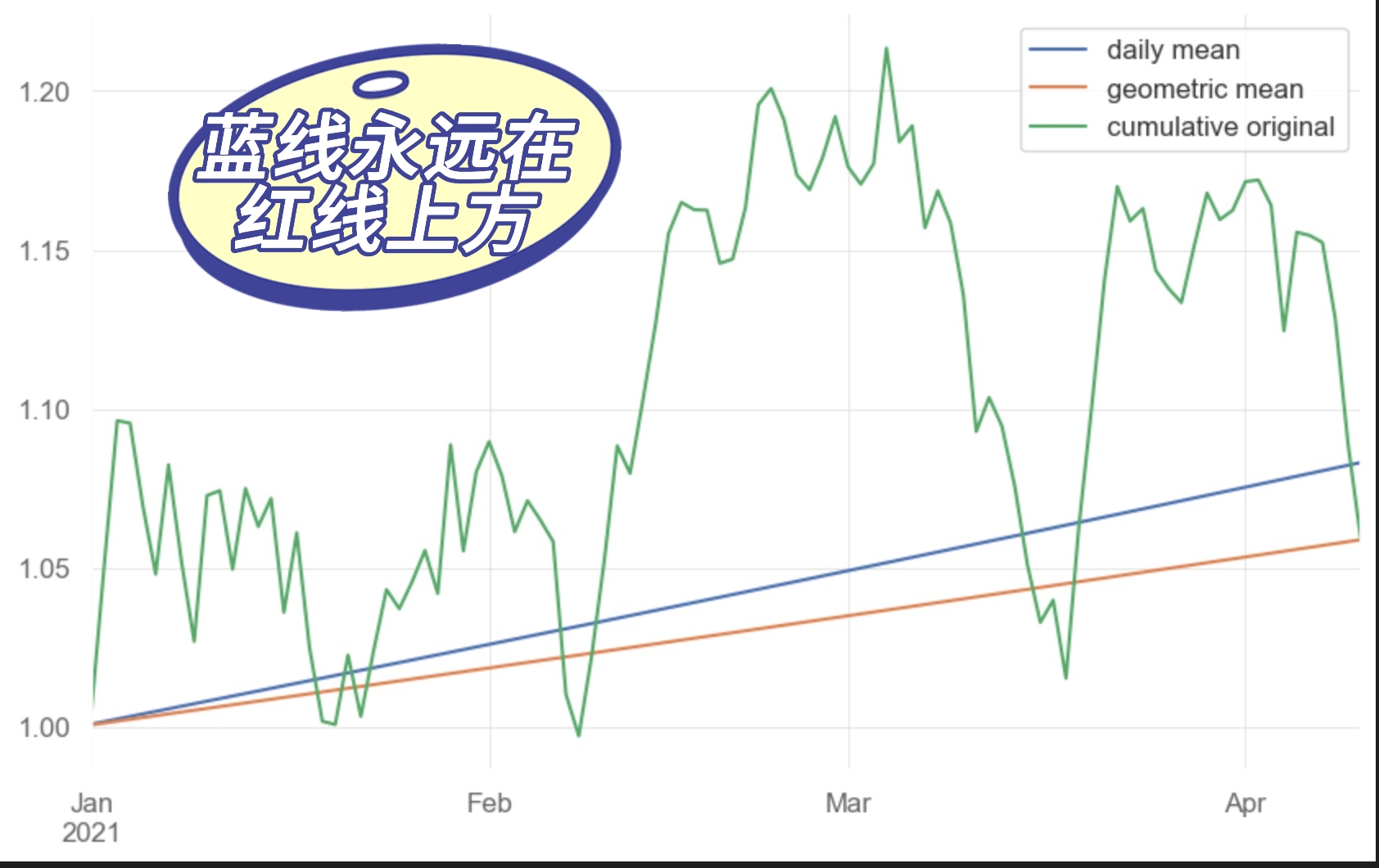 !!! question 为什么无论上涨或是下跌,蓝线永远在红线上方? Answer:根据均值不等式: 算数平均数 ≥ 几何平均数