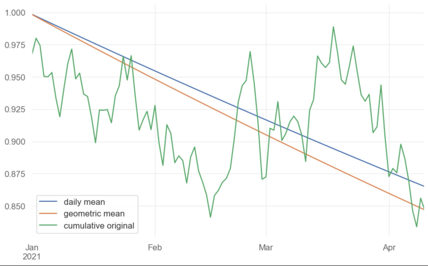 现在,我们通过下方代码生成一系列随机数,我们可以生成很多个上涨或下跌情况下的净值走势以及它们的算术平均数和几何平均数从起点到终点的变化路径
